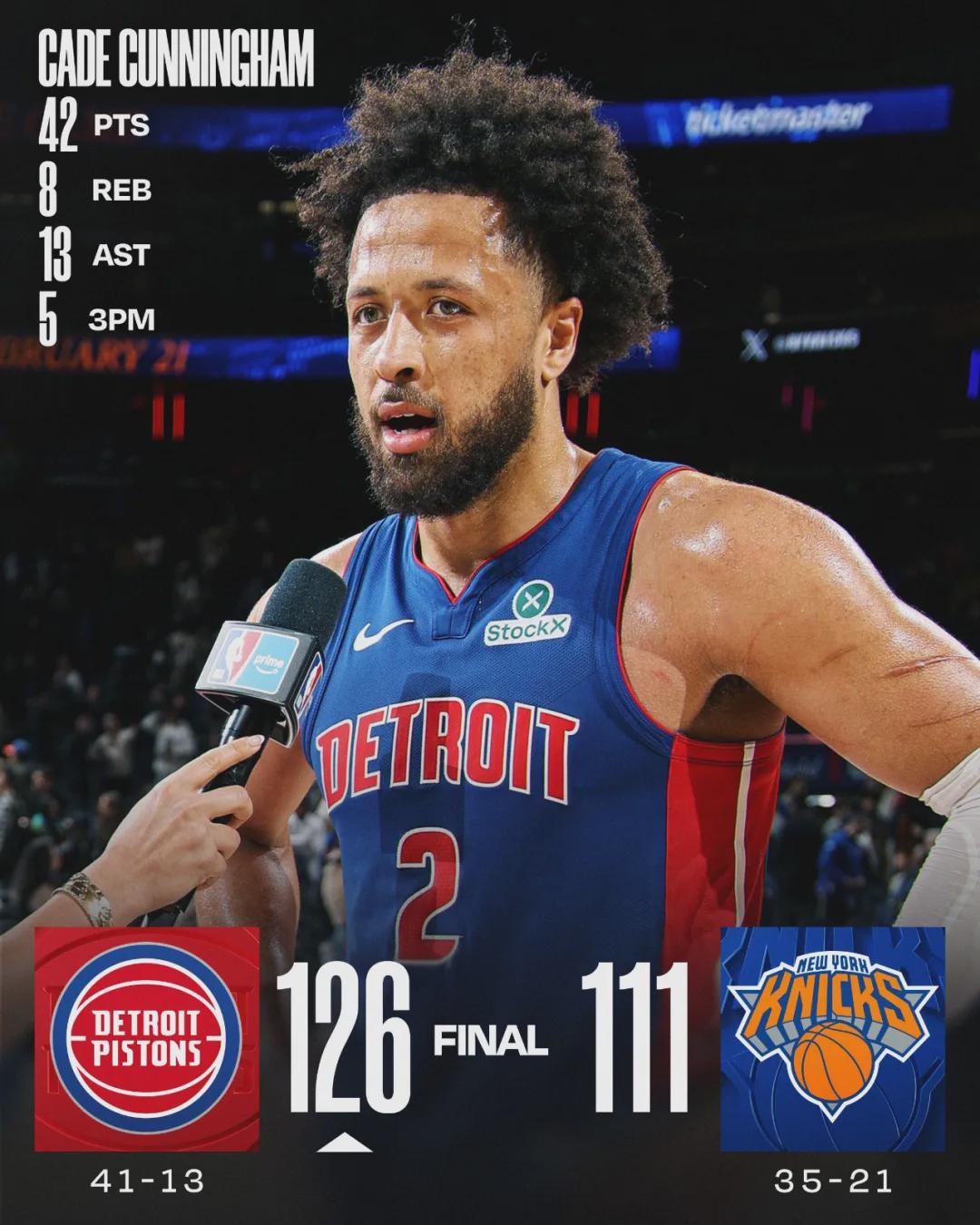 活塞状元坎宁安今天开启暴走模式:首发出战38分钟,34投17中,三分11中5,罚球3中3,狂轰42分8篮板13助攻1抢断2盖帽。他成为NBA历史上第三个在麦迪逊广场花园轰下40分+10助攻的客队球员,前两个是艾弗森和詹姆斯。