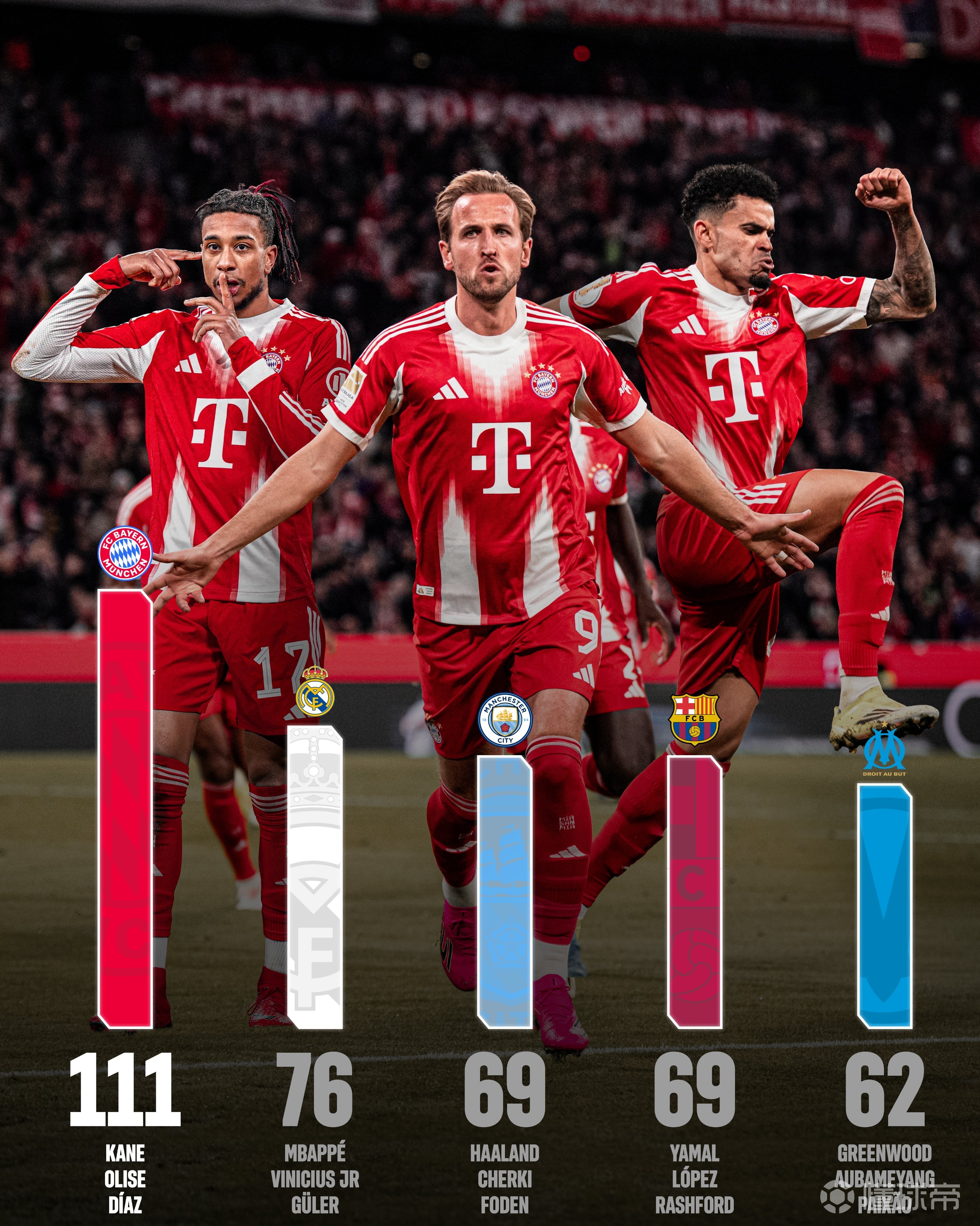 拜仁慕尼黑官推晒图,凯恩、奥利塞、迪亚斯的参与进球数合计111球,并写道:没有其他进攻组合的参与进球数能比得上凯恩、奥利塞、迪亚斯!